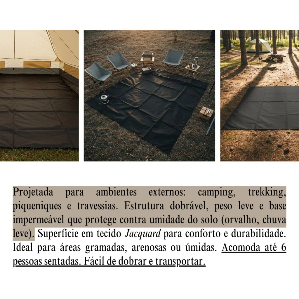 Manta Impermeável para Camping 135×135 cm, ideal para camping, trekking e atividades ao ar livre. Protege contra umidade e oferece conforto para até 6 pessoas, sendo leve, compacta e fácil de transportar.